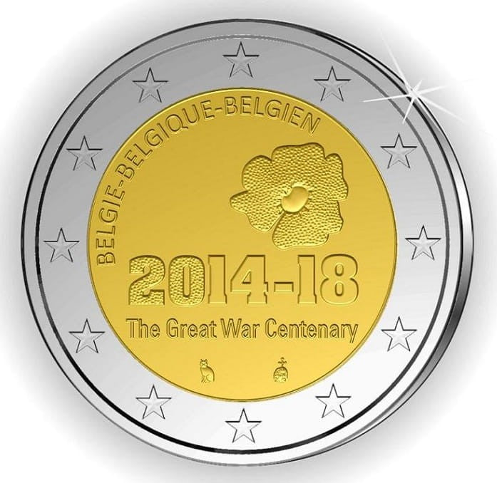 Opis: Wewnętrzna część monety przedstawia kwiat maku polnego. Pod nim umieszczono oznaczenie lat „2014–2018”. Poniżej widnieje napis „The Great War Centenary” (100. rocznica Wielkiej Wojny), pod którym znajdują się znak mincmistrza i znak mennicy brukselskiej – głowa archanioła Michała w hełmie. Wzdłuż górnej krawędzi biegnie nazwa kraju w trzech językach „BELGIE – BELGIQUE – BELGIEN”. W otoku monety widnieje 12 gwiazd Unii Europejskiej.