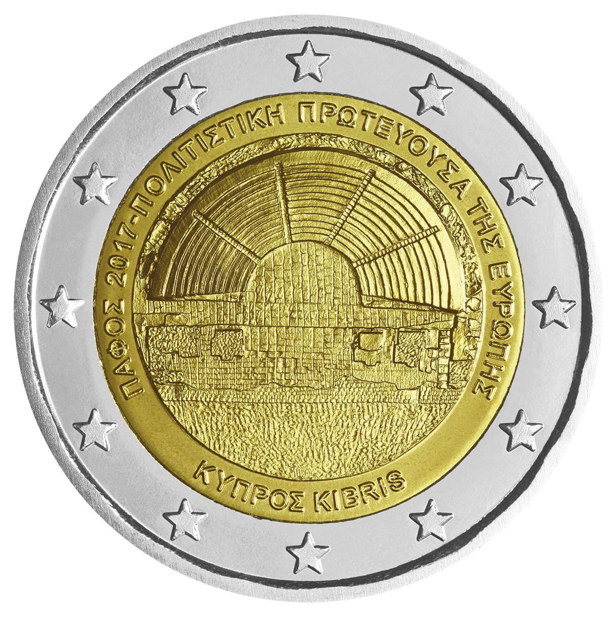 Opis: Moneta przedstawia Odeon w Pafos, niewielki amfiteatr z II w. n.e. Współcześnie służy on latem jako miejsce przedstawień muzyczno-teatralnych. Tu właśnie odbędzie się wiele imprez z programu „Pafos 2017 – Europejska Stolica Kultury”. Wzdłuż otoku biegną nazwa kraju emisji w językach greckim i tureckim „ΚΥΠΡΟΣ KIBRIS” oraz napis „Πάφος 2017 – Πολιτιστική πρωτεύουσα Ευρώπης” (Pafos 2017 – Europejska Stolica Kultury). W otoku monety widnieje 12 gwiazd Unii Europejskiej.