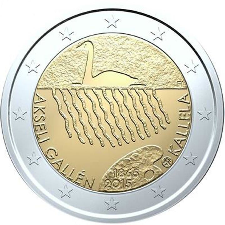 Opis: W górnej części głównego motywu widnieje płynący łabędź z Tuoneli. Poniżej w wodzie rozchodzą się fale wywołane przez odchodzącą duszę. Na prawym krańcu linii horyzontu znajduje się oznaczenie kraju emisji „FI”. Na dole głównego motywu umieszczono paletę malarską, a na niej rok urodzenia malarza „1865” oraz rok emisji „2015”. Obok palety znajduje się znak mennicy. Wzdłuż otoku poniżej linii horyzontu biegnie imię i nazwisko malarza „AKSELI GALLEN KALLELA”. W otoku monety widnieje 12 gwiazd Unii Europejskiej.