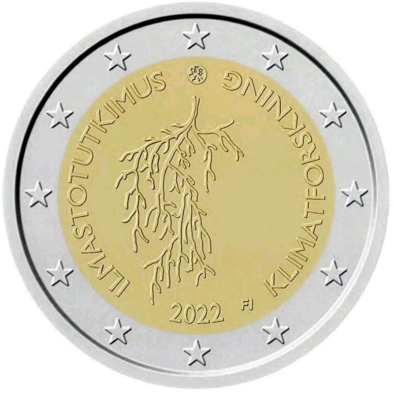 Opis: Motywem monety jest stylizowana brodaczka. Jej podobna do korzeni struktura znajduje się w centrum wewnętrznej części monety. Wzdłuż brzegów tej części biegną dwa napisy „BADANIA KLIMATYCZNE”: po lewej stronie w języku fińskim i po prawej stronie w języku szwedzkim. Na dole części wewnętrznej umieszczono napis „2022 FI”, zaś na górze – znak mennicy fińskiej. W otoku monety widnieje 12 gwiazd z flagi Unii Europejskiej.