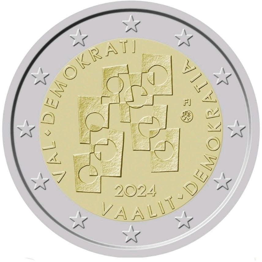Opis: Moneta przedstawia stylizowane karty do głosowania. Składają się one z kół i prostokątów, ukazanych w abstrakcyjny, lecz zrozumiały sposób. Widać osiem kart do głosowania, które częściowo się pokrywają i w miejscach nachodzenia na siebie tworzą mniejsze kształty geometryczne. Na dole umieszczono rok „2024”, a nieco powyżej linii środkowej po prawej stronie – symbol „FI”. Wzdłuż wewnętrznej krawędzi po prawej stronie biegnie półkoliście napis „VAALIT ♦ DEMOKRATIA”, a po lewej stronie – „VAL ♦ DEMOKRATI”. W otoku monety widnieje 12 gwiazd z flagi Unii Europejskiej.