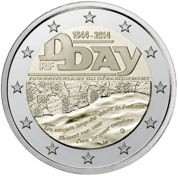 Opis: W środkowej części monety widnieje napis „D-DAY” układający się w kształt jednocześnie łodzi desantowej i lufy czołgu. Nad lufą znajdują się lata „1944–2014”, a pod łodzią – napis „70e ANNIVERSAIRE DU DÉBARQUEMENT” (70. rocznica lądowania). Pod napisem widać charakterystyczne odciski butów armii amerykańskiej, brytyjskiej i kanadyjskiej, zacierane przez napływającą falę. Na fali wygrawerowany jest fragment wiersza Verlaine’a, będący hasłem do rozpoczęcia lądowania: „Les sanglots longs des violons de l’automne blessent mon cœur d’une langueur monotone” („Łkanie bezsennej skrzypki jesiennej, sierocej, serce mi rani, grąży w otchłani niemocy”). W otoku monety widnieje 12 gwiazd Unii Europejskiej.