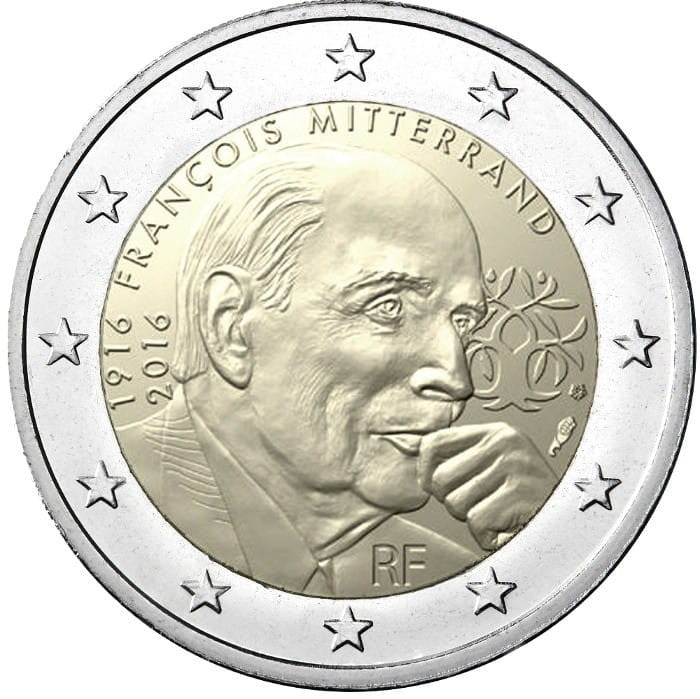 Opis: Moneta przedstawia zamyślonego François Mitterranda z półprofilu. Obok widoczny jest jego symbol prezydencki: w połowie dąb, w połowie drzewo oliwne. Z lewej strony umieszczono daty upamiętniające setną rocznicę urodzin Mitterranda („1916” i „2016”), a nad motywem jego imię i nazwisko. Na dole znajduje się oznaczenie kraju emisji „RF”. W otoku monety widnieje 12 gwiazd Unii Europejskiej.