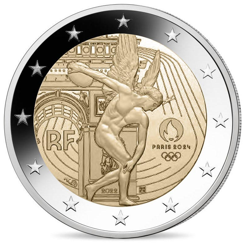 Opis: Po 100 latach od olimpiady w 1924 Francja ponownie będzie gospodarzem letnich igrzysk, które odbędą się w 2024 w Paryżu. To wydarzenie cieszy się na świecie dużym zainteresowaniem, które stopniowo rośnie w latach je poprzedzających. Mennica paryska chce upamiętnić przygotowania do igrzysk olimpijskich. W związku z tym zaplanowała emisję w 2022, 2023 i 2024 okolicznościowej monety 2 euro ze specjalną stroną narodową upamiętniającą igrzyska olimpijskie oraz dziedzictwo Francji i Paryża. Motywem monety jest uskrzydlony anioł (Geniusz), symbol narodowy i ikona francuskiej numizmatyki. Jest przedstawiony podczas rzutu dyskiem „starożytną” techniką, co jest nawiązaniem do igrzysk olimpijskich z czasów antycznych. Jego sylwetka zlewa się w jednej osi z Łukiem Triumfalnym, istotnym elementem paryskiego dziedzictwa i symbolicznym pomnikiem zwycięstwa. W tle widać bieżnię lekkoatletyczną, a po jej prawej stronie – emblemat olimpiady w Paryżu w 2024. Pod łukiem i wokół jego podstawy umieszczono rok, litery „RF” i znaki mennicy. W otoku monety widnieje 12 gwiazd z flagi Unii Europejskiej.