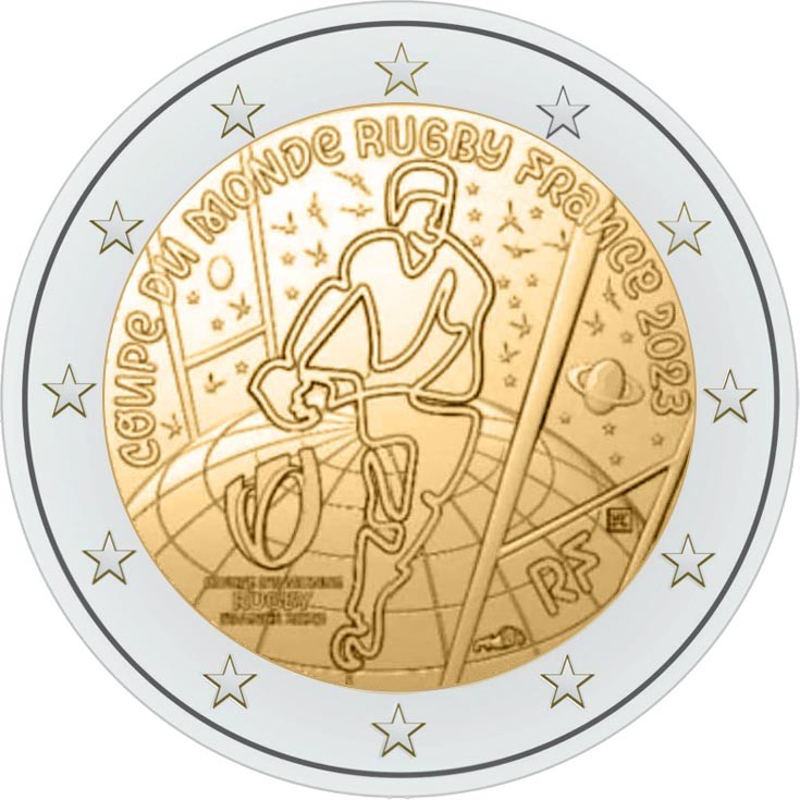 Opis: Z okazji Pucharu Świata w Rugby we Francji mennica paryska upamiętnia rugby i ten turniej, w którym udział bierze dwadzieścia zespołów z różnych krajów. Motyw przedstawia stylizowaną sylwetkę rugbisty wykonującego podanie. W tle umieszczono boisko do rugby w kształcie kuli ziemskiej, na której stoją bramki. To boisko jest częścią fantastycznej galaktyki rugby, w której inne planety są owalne. Obok rugbisty znajduje się logo pucharu świata. Motyw otacza nazwa tego turnieju. Na dole po prawej znajdują się oznaczenie kraju emisji „RF”, znak mennicy i znak mincerski. Wzdłuż wewnętrznej krawędzi otoku po lewej stronie umieszczono nazwę turnieju, a po prawej nazwę kraju emisji „FRANCE” i rok „2023”. Nazwę turnieju i litery „RF” zapisano oficjalną czcionką turnieju – Mobius. W otoku monety widnieje 12 gwiazd z flagi Unii Europejskiej.