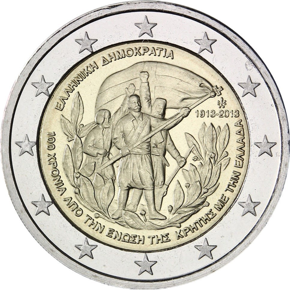 Opis: Wewnętrzna część monety przedstawia rebeliantów z Krety wznoszących grecką flagę, symbolizujących walkę Krety o unię z Grecją. W górnej części biegnie po łuku zapisana wielkimi literami nazwa kraju emisji „Republika Grecka” w języku greckim. Poniżej znajduje się napis „100 lat unii Krety z Grecją”, również w języku greckim. Po prawej stronie umieszczono daty „1913–2013” oraz monogram mennicy greckiej. W otoku monety widnieje 12 gwiazd Unii Europejskiej.