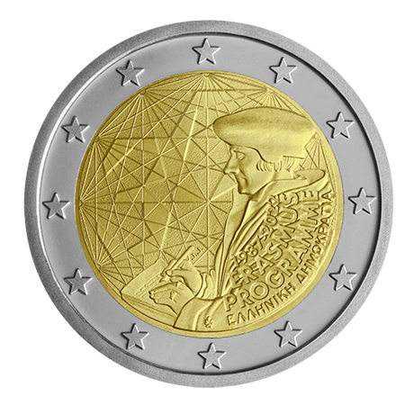 2 euro z 2022 r. poświęconą 35. rocznicy powstania programu Erasmus. Motyw monety przedstawia postać filozofa Erazma z Rotterdamu podczas pisania. W tle liczne linie łączą się w różnych punktach symbolizujący liczne wymiany intelektualne i ludzkie między studentami europejskimi. Wśród tych linii pojawia się również liczba 35, przedstawiona w nowoczesnym stylu graficznym, symbolizująca trzydziestą piątą rocznicę programu Erasmus.