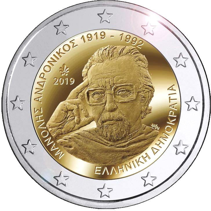 Opis: Manolis Andronicos (1919–1992) był jednym z najważniejszych greckich archeologów. W 1977 odkrył królewskie grobowce w Verginie, zawierające wyjątkowe znaleziska, dzięki którym świat poznał świetność starożytnej cywilizacji macedońskiej. Na monecie przedstawiono wizerunek Andronicosa. Przy otoku z lewej strony znajduje się jego imię i nazwisko w języku greckim oraz lata „ΜΑΝΟΛΗΣ ΑΝΔΡΟΝΙΚΟΣ 1919-1992”, a z prawej – nazwa kraju „ΕΛΛΗΝΙΚΗ ΔΗΜΟΚΡΑΤΙΑ” (Republika Grecka). Obok wizerunku z lewej strony wybito rok emisji i palmetę (znak mennicy greckiej), a z prawej – monogram projektanta Georgiosa Stamatopoulosa. W otoku monety widnieje 12 gwiazd Unii Europejskiej.