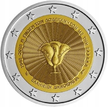Opis: W centralnej części motywu znajduje się róża, godło Rodos, wzorowana na monecie bitej przez starożytne miasto Rodos, jednej z najbardziej charakterystycznych monet Dodekanezu. Wokół róży ku brzegom monety rozchodzą się stylizowane fale. Przy otoku biegną napisy „1948–2018 Η ΕΝΩΣΗ ΤΩΝ ΔΩΔΕΚΑΝΗΣΩΝ ΜΕ ΤΗΝ ΕΛΛΑΔΑ” (1948–2018 zjednoczenie Dodekanezu z Grecją) i „ΕΛΛΗΝΙΚΗ ΔΗΜΟΚΡΑΤΙΑ” (Republika Grecka). Z lewej strony wybito palmetę (znak mennicy greckiej), a z prawej – monogram projektanta Georgiosa Stamatopoulosa. W otoku monety widnieje 12 gwiazd Unii Europejskiej.