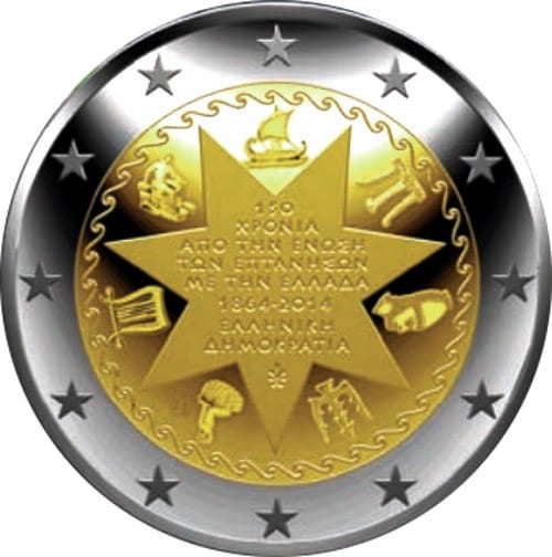 Opis: W wewnętrznej części monety widać siedmioramienną gwiazdę, a w niej – napis w języku greckim „150 ΧΡΟΝΙΑ ΑΠΟ ΤΗΝ ΕΝΩΣΗ ΤΩΝ ΕΠΤΑΝΗΣΩΝ ΜΕ ΤΗΝ ΕΛΛΑΔΑ 1864–2014” (150 lat od zjednoczenia Wysp Jońskich z Grecją 1864–2014), nazwę kraju emisji „ΕΛΛΗΝΙΚΗ ΔΗΜΟΚΡΑΤΙΑ” (Republika Grecka) oraz znak greckiej mennicy państwowej. Między ramionami gwiazdy znajdują się symbole Wysp Jońskich. Cały wzór jest otoczony stylizowanym rysunkiem fal. W otoku monety widnieje 12 gwiazd Unii Europejskiej.