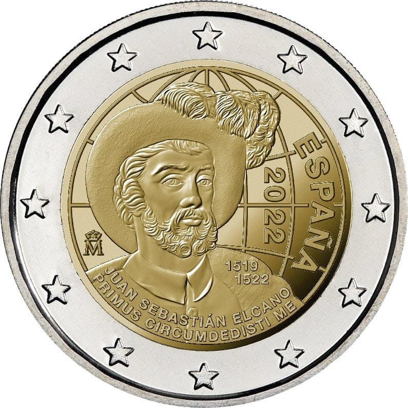 Opis: Wyprawa, która w 1522 zakończyła się pierwszym opłynięciem kuli ziemskiej, rozpoczęła się w 1519 w Sewilli. Motyw monety łączy w sobie dwa obrazy: portret Juana Sebastiána Elcano na tle kuli ziemskiej. Pod portretem wielkimi literami napisano frazy „JUAN SEBASTIÁN ELCANO” i „PRIMUS CIRCUMDEDISTI ME” (PIERWSZY, KTÓRY MNIE OPŁYNĄŁEŚ), a na wysokości ramienia przedstawionej postaci – lata rozpoczęcia i zakończenia ekspedycji (1519–1522). Z prawej strony znajdują się zapisana wielkimi literami nazwa kraju emisji „ESPAÑA” i rok wybicia „2022”. Z lewej strony umieszczono znak mennicy. W otoku monety widnieje 12 gwiazd z flagi Unii Europejskiej.
