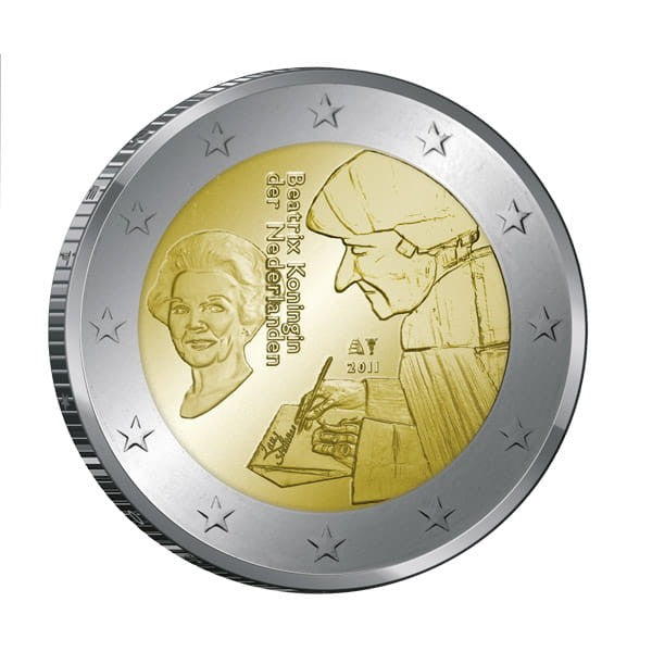 Opis: W środkowej części monety po prawej stronie ukazany jest Erazm przy pisaniu swego dzieła, a po lewej – wizerunek królowej Beatrix. Pomiędzy nimi biegnie pionowo napis „Beatrix Koningin der Nederlanden” (Beatrix, królowa Holandii). Pośrodku umieszczono poziomo oznaczenie roku „2011”, znak mincmistrza i znak mennicy.