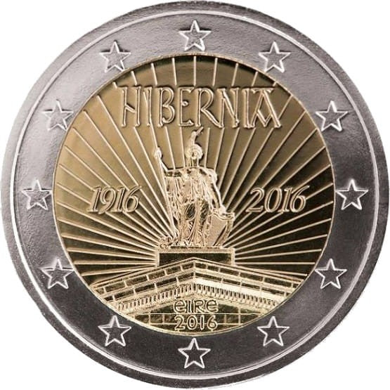 Opis: Motywem monety jest posąg Hibernii stojący na gmachu dublińskiej Poczty Głównej – od zdobycia tego budynku w 1916 roku rozpoczęło się powstanie wielkanocne. Hibernia jest symbolem Irlandii; jej imię pochodzi od określenia tego kraju w języku starogreckim. Autorem przedstawionej rzeźby jest John Smyth. Hibernia jest ukazana jako świadek wydarzeń z 1916 roku i trwającego przez kolejne sto lat rozkwitu narodu, któremu przyświecają ideały zapisane w Proklamacji Niepodległości Republiki Irlandii. Hibernia, która niezmiennie patrzy naprzód, jest symbolem przeszłości, teraźniejszości i przyszłości tego kraju. Powyżej znajduje się napis „HIBERNIA” wykonany czcionką przypominającą pismo odręczne, wzorowaną na słynnej Księdze z Kells. Promienie słońca symbolizują ideę powstania i proklamacji, czyli świt nowego narodu i republiki. Po obu stronach posągu umieszczono daty: „1916” i „2016”. Na dole przy otoku widnieje nazwa kraju emisji „ÉIRE” (Irlandia), a pod nią rok emisji „2016”. W otoku monety znajduje się 12 gwiazd Unii Europejskiej.