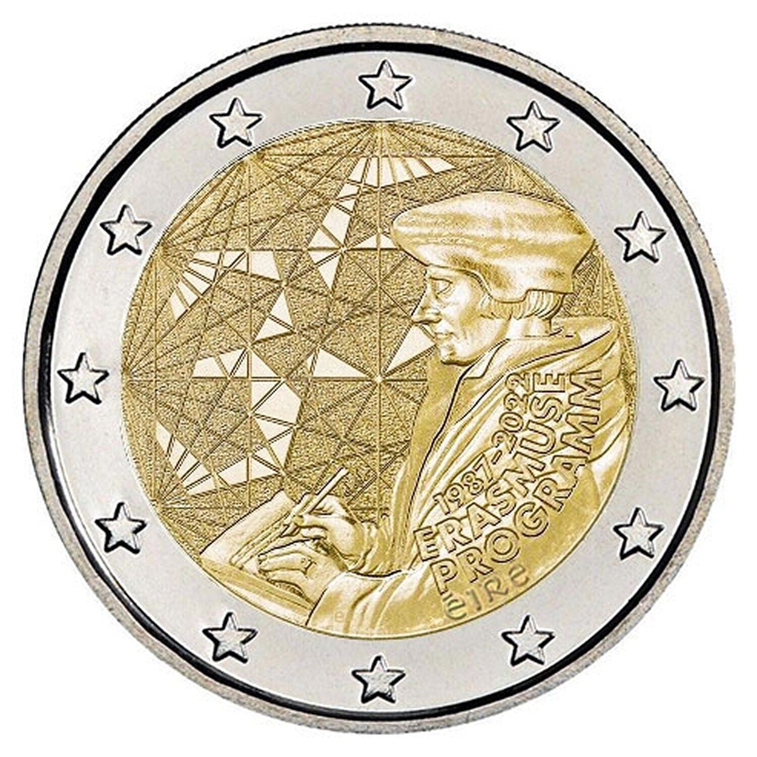2 euro z 2022 r. poświęconą 35. rocznicy powstania programu Erasmus. Motyw monety przedstawia postać filozofa Erazma z Rotterdamu podczas pisania. W tle liczne linie łączą się w różnych punktach symbolizujący liczne wymiany intelektualne i ludzkie między studentami europejskimi. Wśród tych linii pojawia się również liczba 35, przedstawiona w nowoczesnym stylu graficznym, symbolizująca trzydziestą piątą rocznicę programu Erasmus.