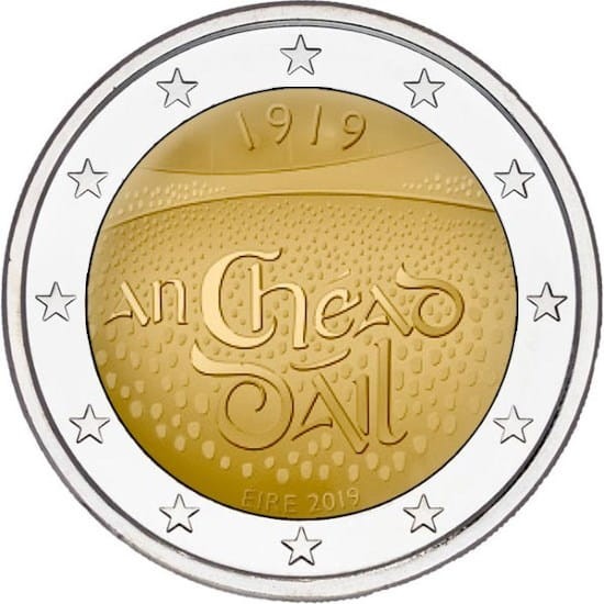 Opis: Motywem monety jest pierwsze posiedzenie Dáil Éireann w Sali Okrągłej gmachu Mansion House. W dniu 21 stycznia naród irlandzki objął władzę i dla uczczenia symbolicznego wymiaru tego posiedzenia przeprowadzono je w całości po irlandzku. Na monecie widać tłumnie zgromadzonych posłów pierwszego pochodzącego z wyborów parlamentu Irlandii, a z tyłu – brzeg wielkiej Sali Okrągłej. Pośrodku umieszczono napis „An Chéad Dáil” (Pierwszy Dáil), a wyżej oznaczenie roku „1919”, wykonane tradycyjną czcionką – uncjałą. Na dole znajdują się nazwa kraju i rok emisji: „ÉIRE 2019” (Irlandia 2019). W otoku monety widnieje 12 gwiazd Unii Europejskiej.
