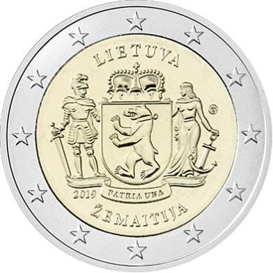 Opis: Centralny motyw monety to niedźwiedź w łańcuchowej obroży stojący na tylnych łapach, który od XVI wieku jest godłem Żmudzi. Niedźwiedzia umieszczono na tarczy zwieńczonej koroną. Tarczę trzymają rycerz w zbroi (symbol odwagi, poświęcenia i patriotyzmu) oraz bogini z kotwicą (symbol nadziei). Poniżej znajduje się łaciński napis „PATRIA UNA” (jedna ojczyzna). Nad motywem umieszczono słowo „LIETUVA” (Litwa), pod motywem – „ŽEMAITIJA” (Żmudź), a obok motywu – rok emisji „2019” i znak mennicy litewskiej. W otoku monety widnieje 12 gwiazd z flagi Unii Europejskiej.