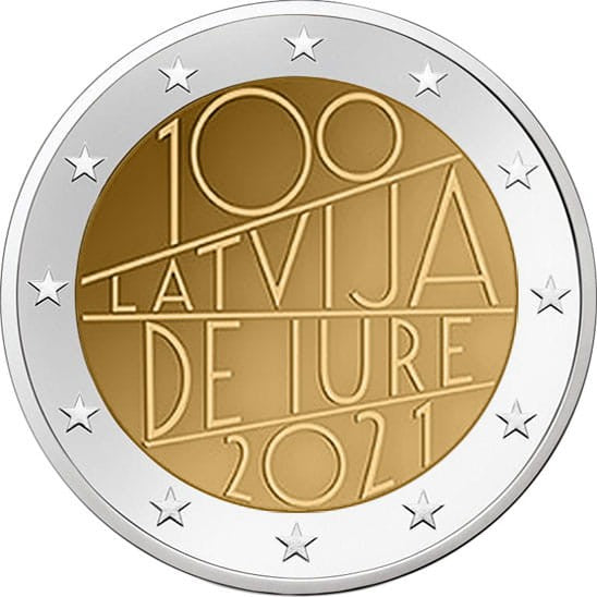 Opis: 26 stycznia 1921 łotewskim dyplomatom udało się doprowadzić do przełomowego wydarzenia – światowe mocarstwa uznały Łotwę de iure. Chociaż Łotwa ogłosiła niepodległość 18 listopada 1918, nowy naród uznano dopiero w 1920, po zakończeniu okresu walk i niepewności. Moneta przedstawia ozdobny napis „100 Latvija de iure 2021”, który zawiera nazwę kraju emisji (LATVIJA) oraz rok emisji (2021). W otoku monety widnieje 12 gwiazd z flagi Unii Europejskiej.