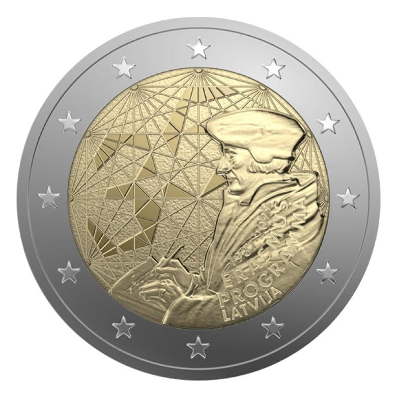2 euro z 2022 r. poświęconą 35. rocznicy powstania programu Erasmus. Motyw monety przedstawia postać filozofa Erazma z Rotterdamu podczas pisania. W tle liczne linie łączą się w różnych punktach symbolizujący liczne wymiany intelektualne i ludzkie między studentami europejskimi. Wśród tych linii pojawia się również liczba 35, przedstawiona w nowoczesnym stylu graficznym, symbolizująca trzydziestą piątą rocznicę programu Erasmus.