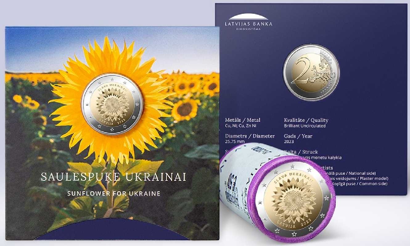 Motyw monety w centralnej części przedstawia jeden z symboli narodu ukraińskiego - słonecznik, który jest silnie obecny w folklorze i kulturze Ukrainy, pojawiając się w kuchni, legendach, literaturze i malarstwie od wielu lat. Ponadto słoneczniki dla wielu Ukraińców są symbolem ojczyzny, ponieważ na tle błękitnego nieba, przypominają kolory flagi narodowej. Na monecie został również w górnej części umieszczony napis 'SLAVA UKRAINAI!', a u dołu nazwa kraju emitującego 'LATVIJA' oraz rok emisji '2023'.