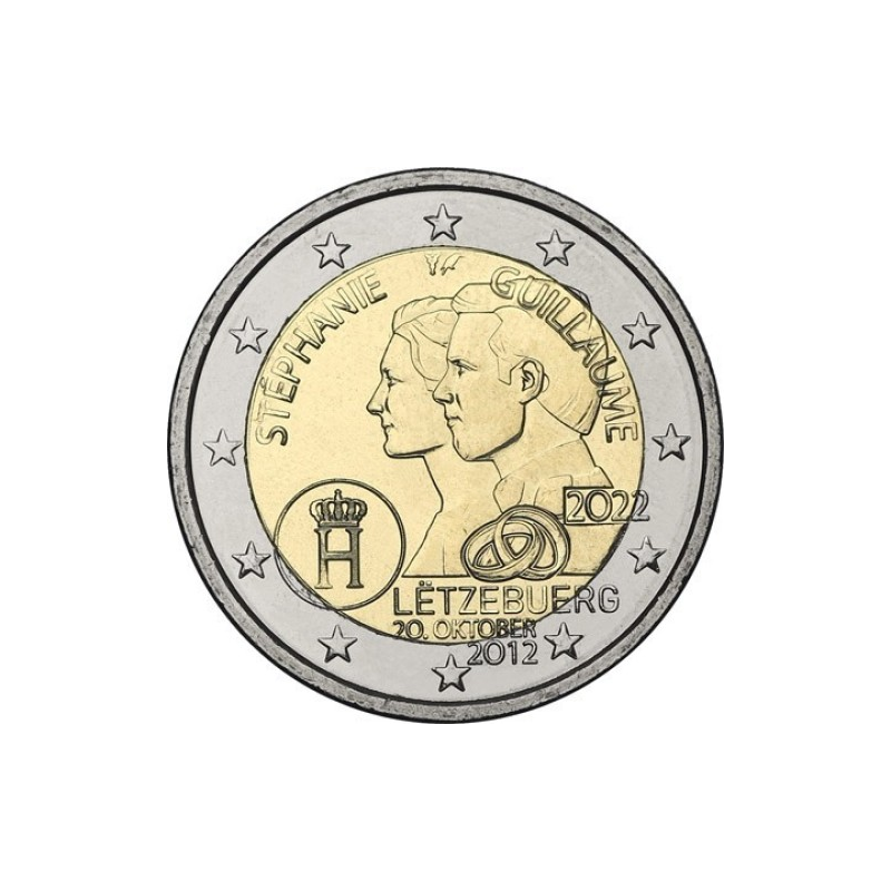 Opis: Głównym motywem są wizerunki dziedzicznego wielkiego księcia Wilhelma i dziedzicznej wielkiej księżnej Stefanii. Obok podobizn biegną półkoliście imiona książęcej pary. Na lewo od oznaczenia roku „2022” widać dwie obrączki. W dolnej części znajdują się nazwa kraju emisji „LËTZEBUERG”, data zaślubin „20. OKTOBER 2012” oraz monogram (litera „H” w koronie), będący znakiem wielkiego księcia Henryka. W otoku monety widnieje 12 gwiazd z flagi Unii Europejskiej.