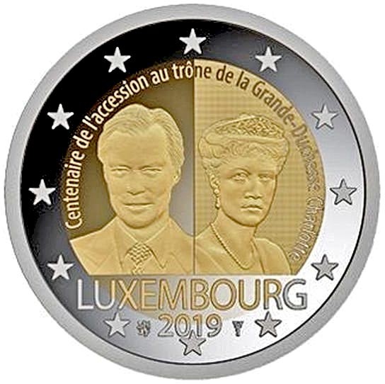 Opis: Po lewej stronie przedstawiono wizerunek wielkiego księcia Henryka, a po prawej – wielkiej księżnej Szarlotty. Na dole widnieje nazwa kraju emisji „LUXEMBOURG”, a pod nią – rok emisji „2019”. Górą wokół wizerunków biegnie półkoliście napis „Centenaire de l’accession au trône de la Grande-Duchesse Charlotte” (Stulecie wstąpienia na tron wielkiej księżnej Szarlotty). W otoku monety widnieje 12 gwiazd Unii Europejskiej.