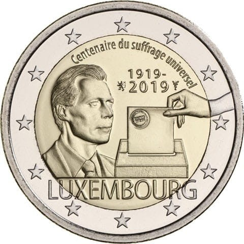 Opis: Po lewej stronie widnieje wizerunek wielkiego księcia Henryka, a po prawej – urna wyborcza i ręka wrzucająca do niej kartę do głosowania. Poniżej znajduje się nazwa kraju emisji „LUXEMBOURG”. Górą przy otoku biegnie półkoliście napis w języku francuskim „Centenaire du suffrage universel” (Stulecie powszechnego prawa wyborczego), a pod nim w dwóch rzędach umieszczono daty „1919–2019”, z których druga to jednocześnie rok emisji. W otoku monety widnieje 12 gwiazd z flagi Unii Europejskiej.