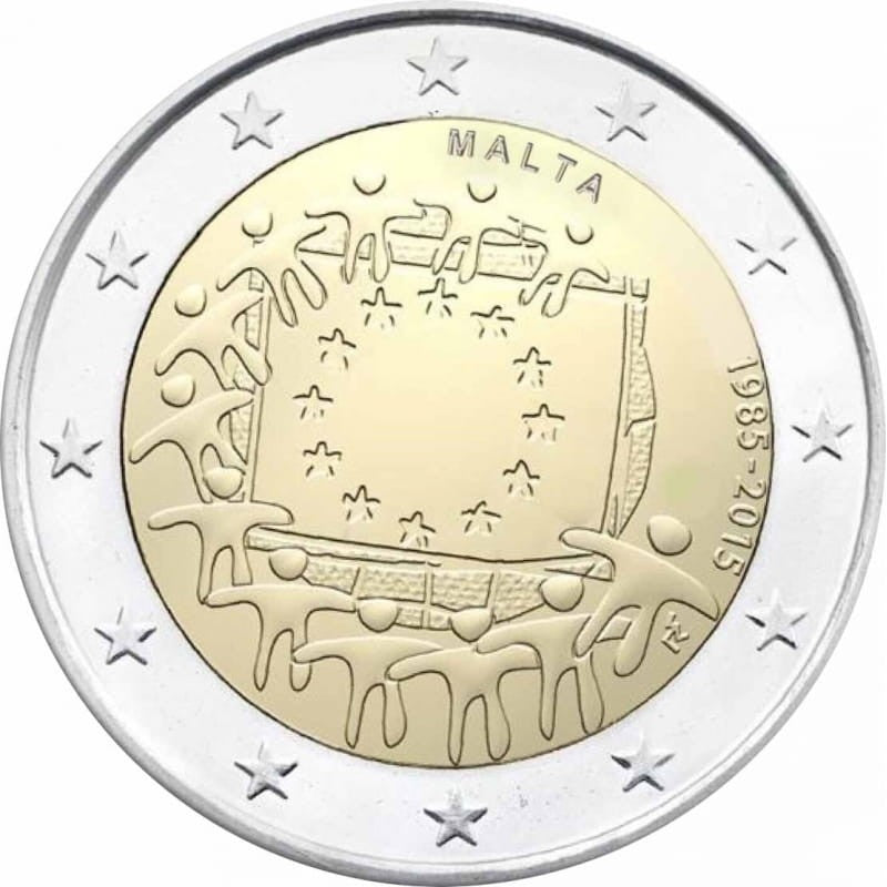 Opis: Moneta przedstawia unijną flagę jako symbol, który jednoczy ludzi i kultury wokół wizji i ideałów lepszej wspólnej przyszłości. Dwanaście gwiazd przechodzących w postaci ludzi okala narodziny nowej Europy. Górą po prawej stronie biegną po półokręgu nazwa kraju emisji i daty „1985–2015”, a niżej znajduje się monogram projektanta Georgiosa Stamatopoulosa. W otoku monety widnieje 12 gwiazd Unii Europejskiej.