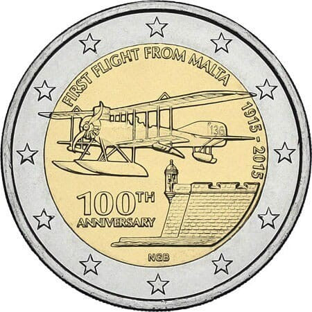 Opis: Moneta upamiętnia ważne wydarzenie w historii maltańskiego lotnictwa – setną rocznicę pierwszego lotu z tej wyspy. 13 lutego 1915 kapitan Kilmer wzniósł się w powietrze hydroplanem z pokładu statku HMS Ark Royal w porcie Grand Harbour i po trwającym 55 minut locie wylądował w tym samym porcie. Moneta ukazuje na pierwszym planie hydroplan Kilmera, a w tle twierdzę Senglea, jedno z najbardziej charakterystycznych miejsc w Grand Harbour. Powyżej biegnie półkoliście napis „FIRST FLIGHT FROM MALTA” (Pierwszy lot z Malty), a po prawej stronie – oznaczenie lat „1915–2015”. Poniżej po lewej stronie znajduje się napis „100TH ANNIVERSARY” (100. rocznica), a na dole przy otoku – inicjały projektanta Noela Galei Basona „NGB”. W otoku monety widnieje 12 gwiazd Unii Europejskiej.