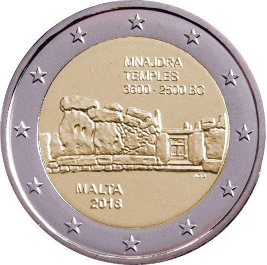 Opis: Moneta przedstawia prehistoryczny kompleks świątynny Mnajdra na Malcie, wpisany na listę światowego dziedzictwa kulturowego UNESCO. Kompleks obejmuje trzy świątynie z owalnym dziedzińcem w środku. Znajduje się na południowym wybrzeżu Malty, ok. 500 metrów od świątyni Hagar Qim. Charakterystyczną cechą Mnajdry jest astronomiczny układ; południową świątynię najprawdopodobniej zbudowano tak, żeby wschód słońca wyznaczał dni równonocy i przesilenia. Najstarsze części kompleksu pochodzą z lat 3600–3200 p.n.e. Nad głównym motywem po prawej stronie umieszczono w trzech rzędach napisy: „MNAJDRA”, „TEMPLES” i lata „3600 - 2500 BC”. Na dole z lewej strony znajduje się nazwa kraju emisji „MALTA”, a pod nią – rok emisji „2018”. W otoku monety widnieje 12 gwiazd Unii Europejskiej.