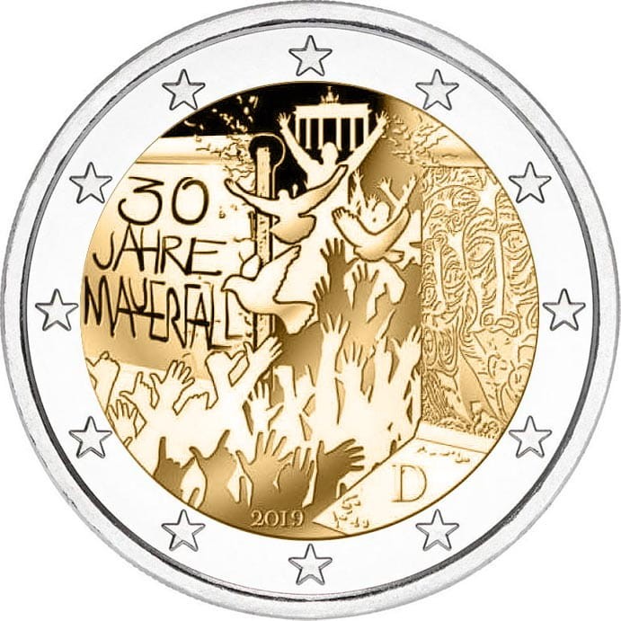 Opis: Trzydzieści lat temu upadł mur berliński. To wydarzenie nie tylko wpłynęło na społeczeństwo niemieckie, lecz także miało skutki globalne. Dzień 9 listopada 1989 jest uznawany za koniec zimnej wojny i zapowiedź ocieplenia stosunków międzynarodowych po kilkudziesięciu latach napięć. W Europie był to pierwszy krok w stronę zjednoczenia jednego z wiodących krajów Unii Europejskiej. Przypieczętował je tzw. traktat dwa plus cztery, którego sygnatariuszem była także Francja. W ciągu jednego roku Unia Europejska zyskała wtedy 16 milionów nowych obywateli, czego skutki strukturalne i gospodarcze były prawie takie, jak w przypadku przyjęcia nowego państwa członkowskiego. Motywem monety jest mur berliński; przez wyrwę pośrodku przelatują gołębie (alegoria międzynarodowego procesu pokojowego) i idzie świętujący tłum. W tle widać Bramę Brandenburską, najbardziej rozpoznawalną budowlę Berlina. Z boku na murze widnieje napis „30 Jahre Mauerfall” (30. rocznica upadku muru). Na dole przy otoku znajdują się oznaczenia roku i kraju emisji – „2019” i „D”. W otoku monety widnieje 12 gwiazd z flagi Unii Europejskiej.