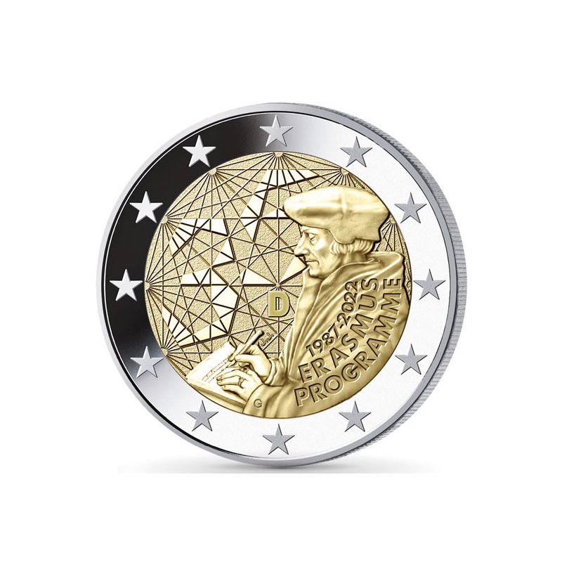 2 euro z 2022 r. poświęconą 35. rocznicy powstania programu Erasmus. Motyw monety przedstawia postać filozofa Erazma z Rotterdamu podczas pisania. W tle liczne linie łączą się w różnych punktach symbolizujący liczne wymiany intelektualne i ludzkie między studentami europejskimi. Wśród tych linii pojawia się również liczba 35, przedstawiona w nowoczesnym stylu graficznym, symbolizująca trzydziestą piątą rocznicę programu Erasmus.
