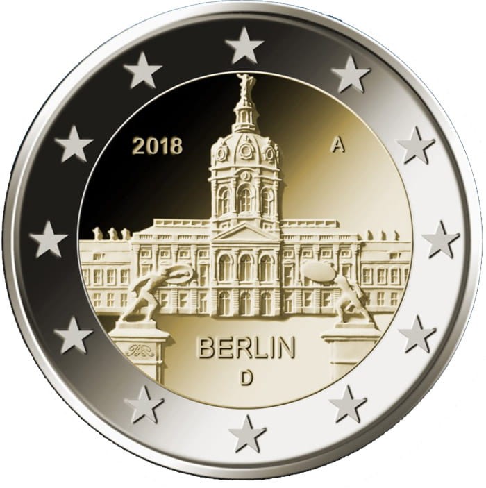 Opis: Moneta przedstawia główny budynek pałacu Charlottenburg wraz z dziedzińcem honorowym. Pod pałacem widnieją: napis „BERLIN” i znak odpowiedniej mennicy („A”, „D”, „F”, „G” lub „J”). Na górze z prawej strony umieszczono kod kraju emisji „D”, a z lewej – rok emisji „2018”. Na dole z lewej strony znajduje się znak grawera. W otoku monety widnieje 12 gwiazd Unii Europejskiej.