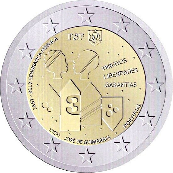 Opis: Moneta przedstawia zarysy budynków i postaci ludzkich jako symbol miast, gdzie przede wszystkim zapewnia się bezpieczeństwo publiczne, i ich mieszkańców, a także schematyczny emblemat policji. Legenda: oznaczenie roku „1867” i roku emisji „2017”, kraj emisji „PORTUGAL”, temat okolicznościowy „SEGURANÇA PÚBLICA” (Bezpieczeństwo publiczne), trzy słowa opisujące główne aspekty obywatelstwa – „DIREITOS”, „LIBERDADES” i „GARANTIAS” (Prawa, swobody i gwarancje) oraz imię i nazwisko projektanta „JOSÉ DE GUIMARÃES”. W otoku monety widnieje 12 gwiazd Unii Europejskiej.