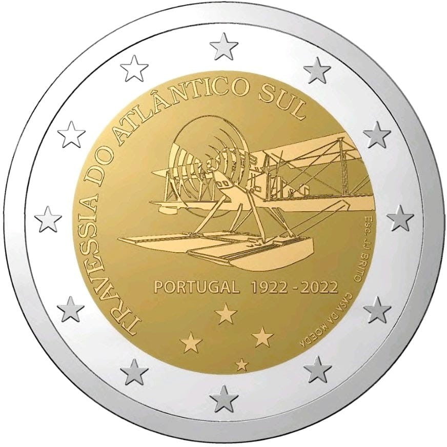Opis: Przelot odbył się wyłącznie przy użyciu pokładowych urządzeń nawigacyjnych, czyli zmodyfikowanego sekstantu i sztucznego horyzontu. Motywem monety jest jeden z trzech dwupłatowców Fairey III, które wykorzystano do przelotu między Lizboną a Rio de Janeiro. Przy wewnętrznej krawędzi otoku biegną słowa „TRAVESSIA DO ATLÂNTICO SUL” (PRZELOT NAD POŁUDNIOWYM ATLANTYKIEM). Pod rysunkiem samolotu znajduje się napis „PORTUGAL 1922–2022”. Znakiem mennicy jest jej portugalska nazwa „CASA DA MOEDA”. W otoku monety widnieje 12 gwiazd z flagi Unii Europejskiej.
