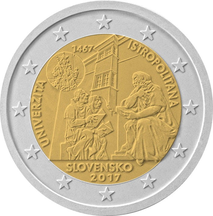 Opis: Na monecie widnieją postacie nauczyciela i dwóch studentów na tle budynku w Bratysławie, w którym niegdyś mieścił się uniwersytet Istropolitana. W górnej części po lewej stronie jest umieszczony medalion jego założyciela – króla Macieja Korwina, a nad medalionem widnieje rok powstania uniwersytetu „1467”. U dołu wewnętrznej części monety znajduje się nazwa kraju emisji „SLOVENSKO” (Słowacja), a pod nią – rok emisji „2017”. Wzdłuż lewej krawędzi widnieje napis „UNIVERZITA”, a wzdłuż prawej krawędzi – „ISTROPOLITANA”. W lewej dolnej części motywu umieszczono znak mennicy w Kremnicy (litery „MK” między dwoma stemplami). Pod nim znajduje się monogram projektantki Márii Poldaufovej – stylizowane litery MP. W otoku monety widnieje 12 gwiazd Unii Europejskiej.
