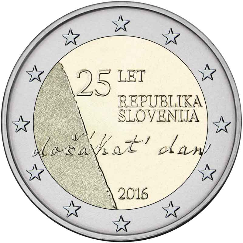 Opis: Wewnętrzną część monety przecina z lewej strony ukośna linia. Na prawo od niej znajdują się napisy: na górze „25 LET” (25 lat), a poniżej „REPUBLIKA SLOVENIJA” (Republika Słowenii). Pod spodem odwzorowano napisane odręcznie słowa „dočákat′ dan” (doczekać dnia), pochodzące z hymnu Słowenii „Zdravljica” (Toast) autorstwa France Prešerena. Na dole przy otoku znajduje się oznaczenie roku „2016”. W otoku monety widnieje 12 gwiazd Unii Europejskiej.