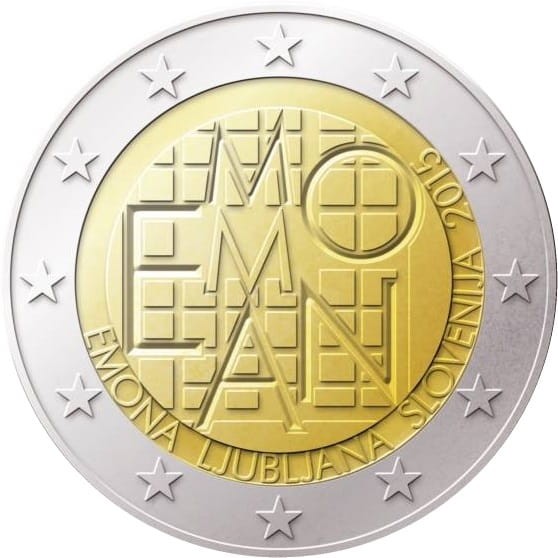 Opis: Na monecie widnieje kompozycja z liter układających się w słowo „EMONA” (lub „AEMONA”) oraz schematyczny plan rzymskiej osady o tej nazwie. Dołem biegnie półkoliście napis „EMONA LJUBLJANA SLOVENIJA 2015”. W otoku monety widnieje 12 gwiazd Unii Europejskiej.