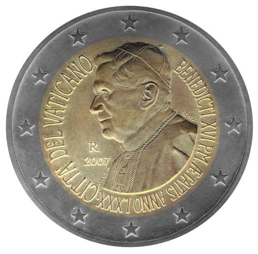 Opis: Wewnętrzna część monety przedstawia Jego Świątobliwość Benedykta XVI, zwróconego profilem w lewo. Wzdłuż krawędzi otoku umieszczono legendę „BENEDICTI XVI P.M. AETATIS ANNO LXXX CITTA' DEL VATICANO”. Po lewej stronie portretu znajduje się symbol mennicy „R”, rok emisji „2007” oraz inicjały grawera „M.C.C. INC.”, natomiast po prawej stronie widnieje nazwisko projektantki monety „LONGO”. W otoku przedstawiono 12 gwiazd Unii Europejskiej.