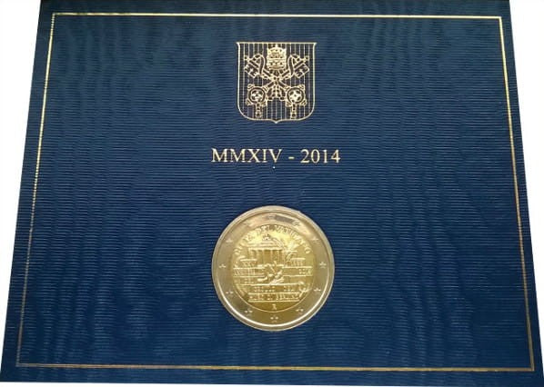 Opis: Na pierwszym planie widać kilka cegieł obrazujących wyrwę w murze, a na nich napis „XXV ANNIVERSARIO DEL CROLLO DEL MURO DI BERLINO 1989 2014” (25. rocznica upadku muru berlińskiego 1989 2014). Pośrodku, między cegłami z fragmentem drutu kolczastego, osadzona jest gałązka oliwna, a w tle widać Bramę Brandenburską. Powyżej biegnie nazwa kraju emisji „CITTÀ DEL VATICANO” (Państwo Watykańskie). W otoku monety widnieje 12 gwiazd Unii Europejskiej.