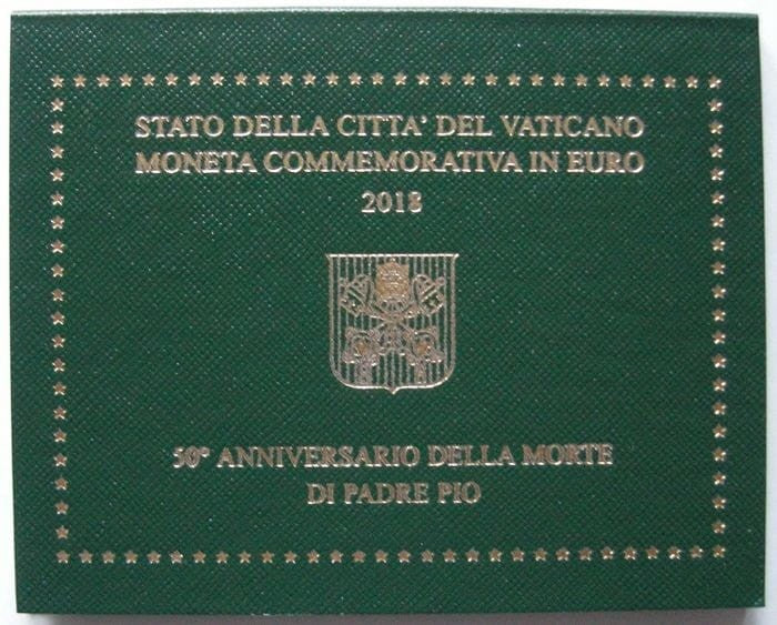 Opis: Moneta przedstawia wizerunek Ojca Pio z profilu, zwrócony w prawo. Górą przy otoku biegnie półkoliście nazwa kraju emisji „CITTÀ DEL VATICANO” (Państwo Watykańskie). Na dole pod wizerunkiem znajduje się napis „Padre Pio”, a po jego prawej stronie – znak mennicy „R”. Obok głównego motywu z lewej strony widnieje oznaczenie roku „1968”, a z prawej – rok emisji „2018”. Niżej z lewej strony znajduje się nazwisko projektanta „P.DANIELE”. W otoku monety widnieje 12 gwiazd Unii Europejskiej.