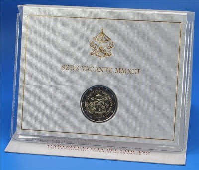 Opis: Na monecie przedstawiono herb kardynała kamerlinga z dwoma małymi krzyżami Kamery Apostolskiej. Powyżej po lewej stronie widnieje nazwa kraju „CITTÀ DEL VATICANO” (Państwo Watykańskie), a po prawej – napis „SEDE VACANTE MMXIII” (Przy nieobsadzonej stolicy 2013). W otoku monety widnieje 12 gwiazd Unii Europejskiej.