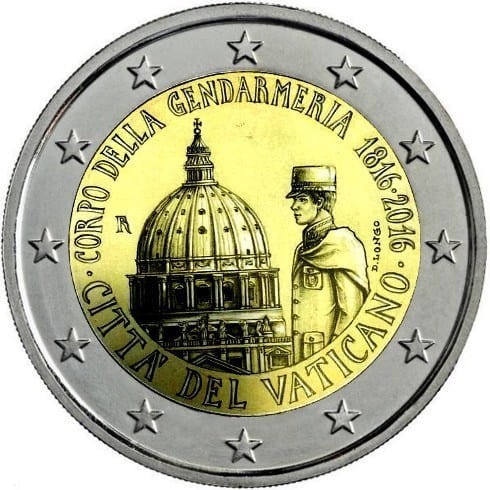 Opis: Strona narodowa przedstawia żołnierza Gwardii Szwajcarskiej i kopułę Bazyliki św. Piotra. Górą biegnie półkoliście napis „CORPO DELLA GENDARMERIA 1816–2016” (Korpus żandarmerii 1816–2016), a dołem nazwa kraju emisji „CITTÀ DEL VATICANO” (Państwo Watykańskie). Obok motywu z lewej strony znajduje się znak mennicy „R”, a z prawej nazwisko projektantki „D. Longo”. W otoku monety widnieje 12 gwiazd Unii Europejskiej.