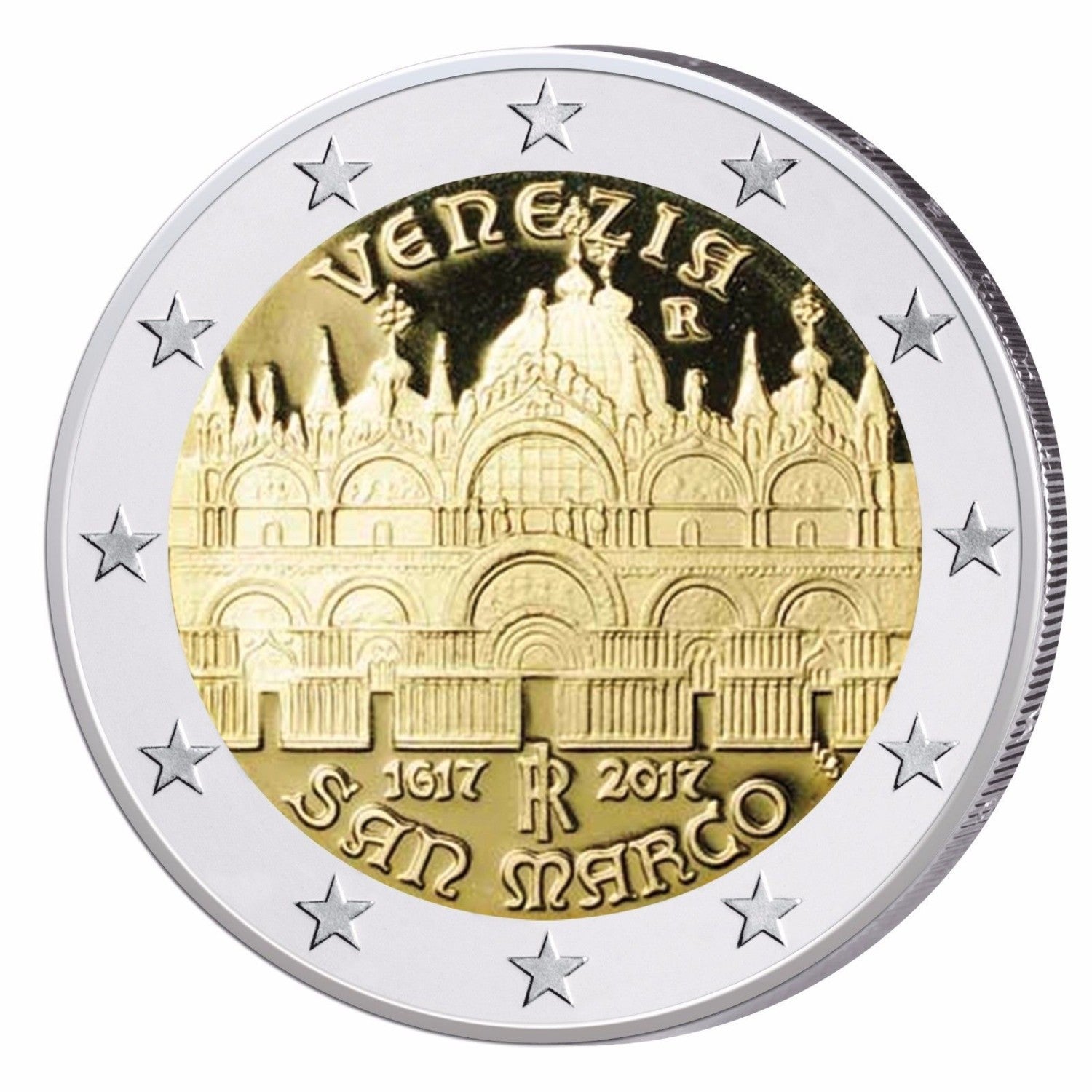 Opis: Moneta przedstawia fasadę bazyliki św. Marka w Wenecji. W dolnym polu widnieje rok zakończenia budowy bazyliki „1617” i rok emisji „2017”, a między nimi – oznaczenie Republiki Włoskiej „RI”. Poniżej znajduje się napis „SAN MARCO”, a po prawej stronie monogram projektantki Luciany De Simoni „LDS”. Na górze umieszczono napis „VENEZIA” oraz znak mennicy rzymskiej „R”. W otoku monety widnieje 12 gwiazd Unii Europejskiej.