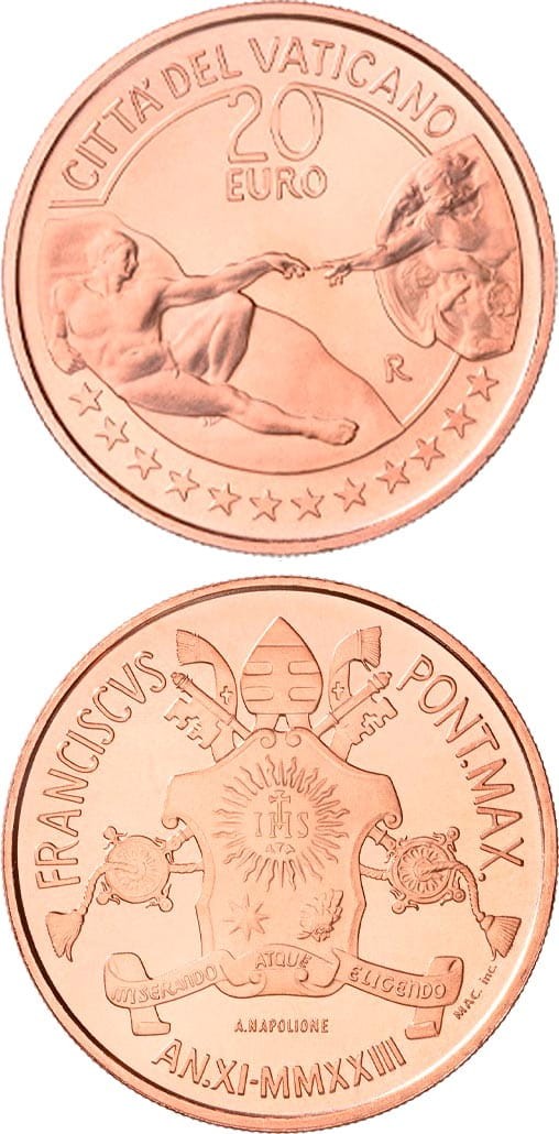 Motyw przestawia "Stworzenie Adama" Michała Anioła. Artystka Antonella Napolione odtwarza na rewersie monety jeden z najbardziej znanych i słynnych obrazów świata: "Stworzenie Adama". Ten fresk został namalowany przez Michała Anioła Buonarrotiego około 1511 roku i znajduje się na sklepieniu Kaplicy Sykstyńskiej. Adam, leżący na ziemi, zwraca swój wzrok w stronę Stworzyciela, wyciągając w Jego kierunku lewą rękę. Bóg, unoszący się w obłoku, wyciąga swoją prawą rękę w stronę Adama, aby obdarzyć go życiem. Na monecie został wybity również napis CITTA' DEL VATICANO oraz nominał 20 EURO.