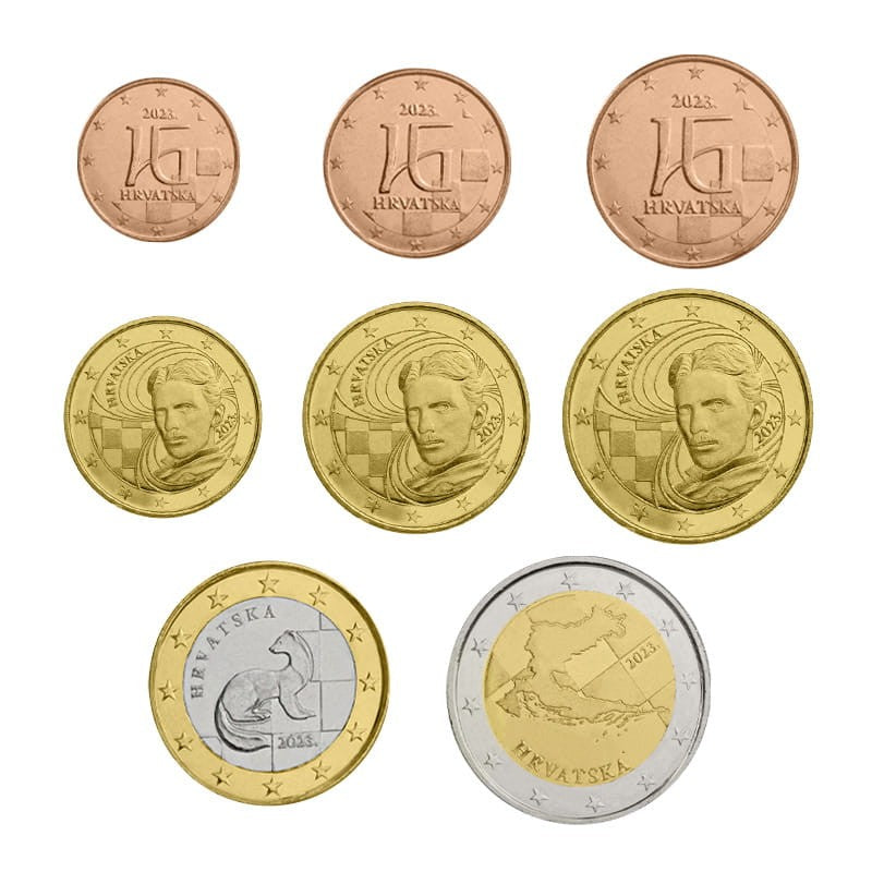 Monety 1 € : Moneta 1 euro przedstawia kunę z szachownicą w tle. Autorami projektu są Jagor Šunde, David Čemeljić i Fran Zekan. Kuna to niewielki ssak, od którego pochodzi nazwa byłej waluty Chorwacji. Na monecie znajdują się także rok emisji i słowo „HRVATSKA” – nazwa tego kraju w języku chorwackim.
