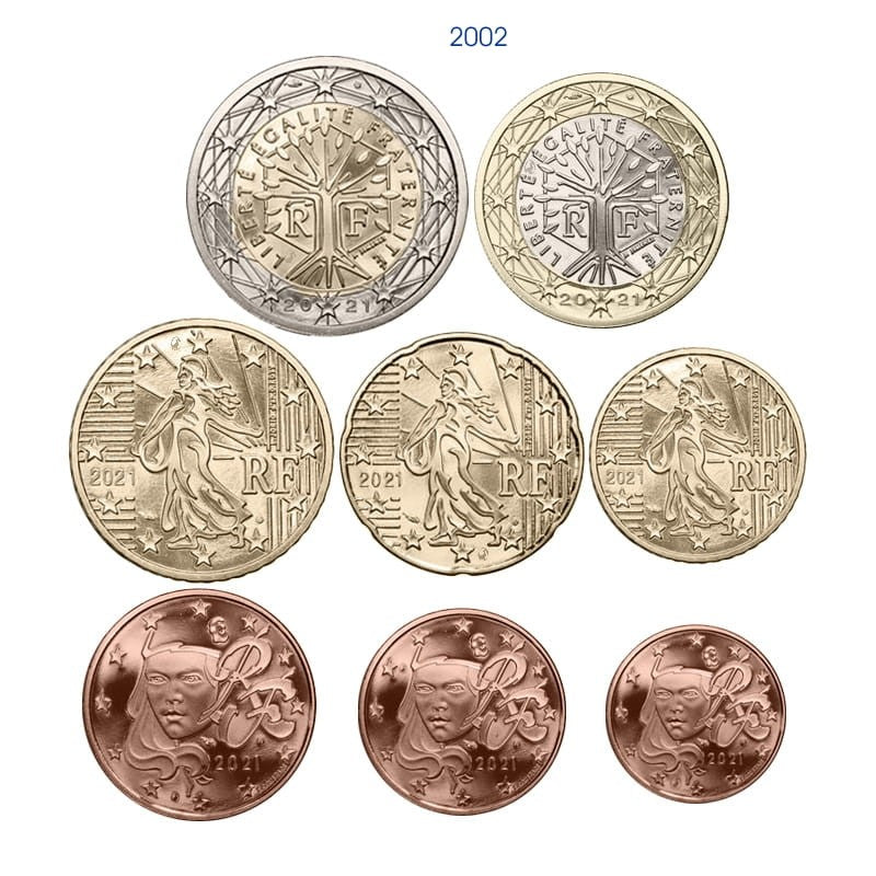 Monety 1 € i 2 €: na monetach figuruje zaprojektowany przez artystę Joaquima Jimineza wizerunek drzewa symbolizującego życie, ciągłość i wzrost. Drzewo wpisane jest w sześciokąt i otoczone hasłem Republiki: „Liberté, Egalité, Fraternité" (wolność, równość, braterstwo). Napis na brzegu monety 2 €: 2**, sześciokrotnie powtórzone, skierowane na przemian w stronę awersu i rewersu.